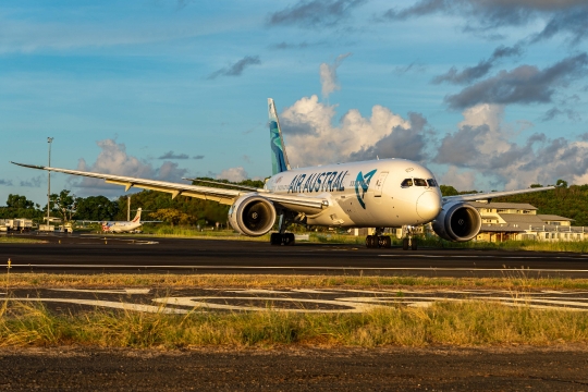 Aéroport Dreamliner Mayotte Sunset air austral avion boeing 787 décollage piste longue