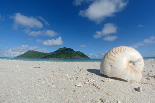 Ilot Mtsamboro vu de ilot de sable blanc. Coquillage Nautile